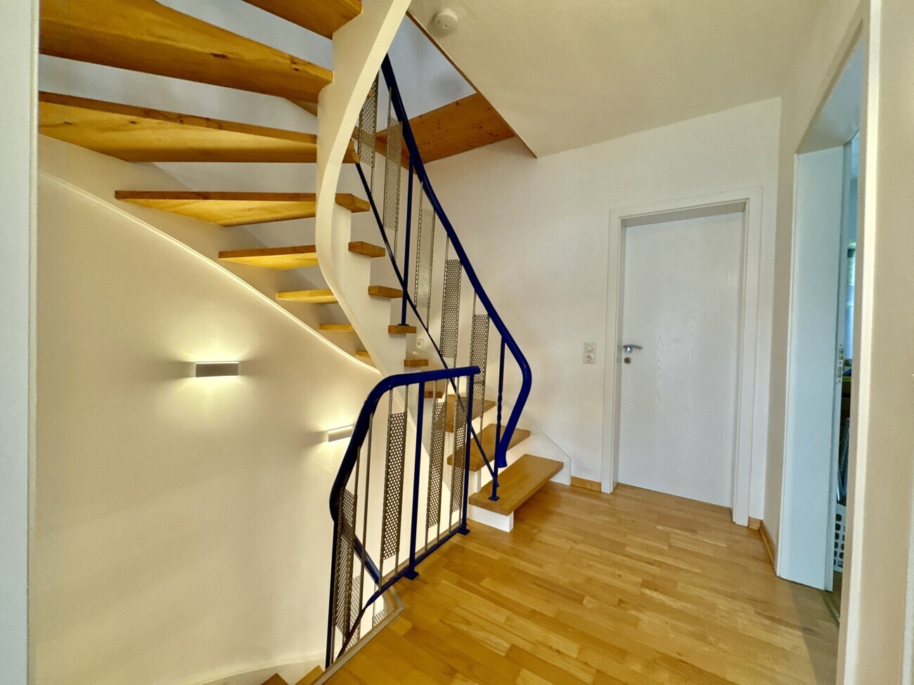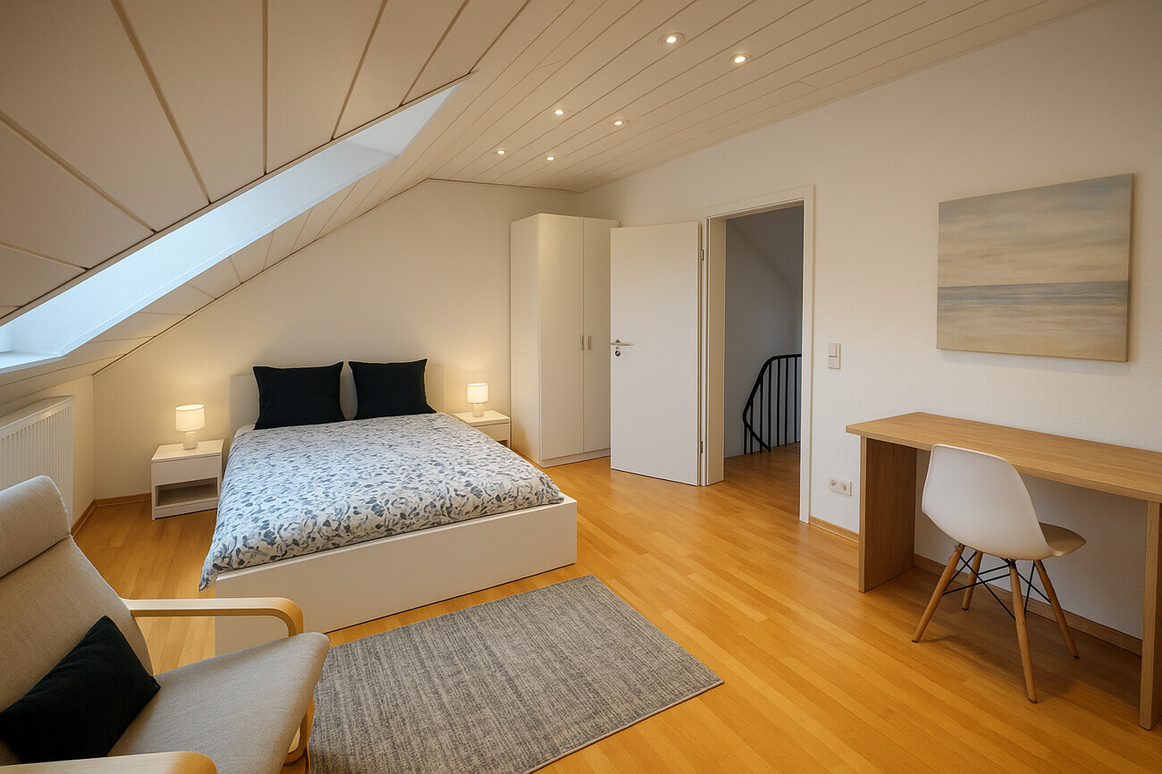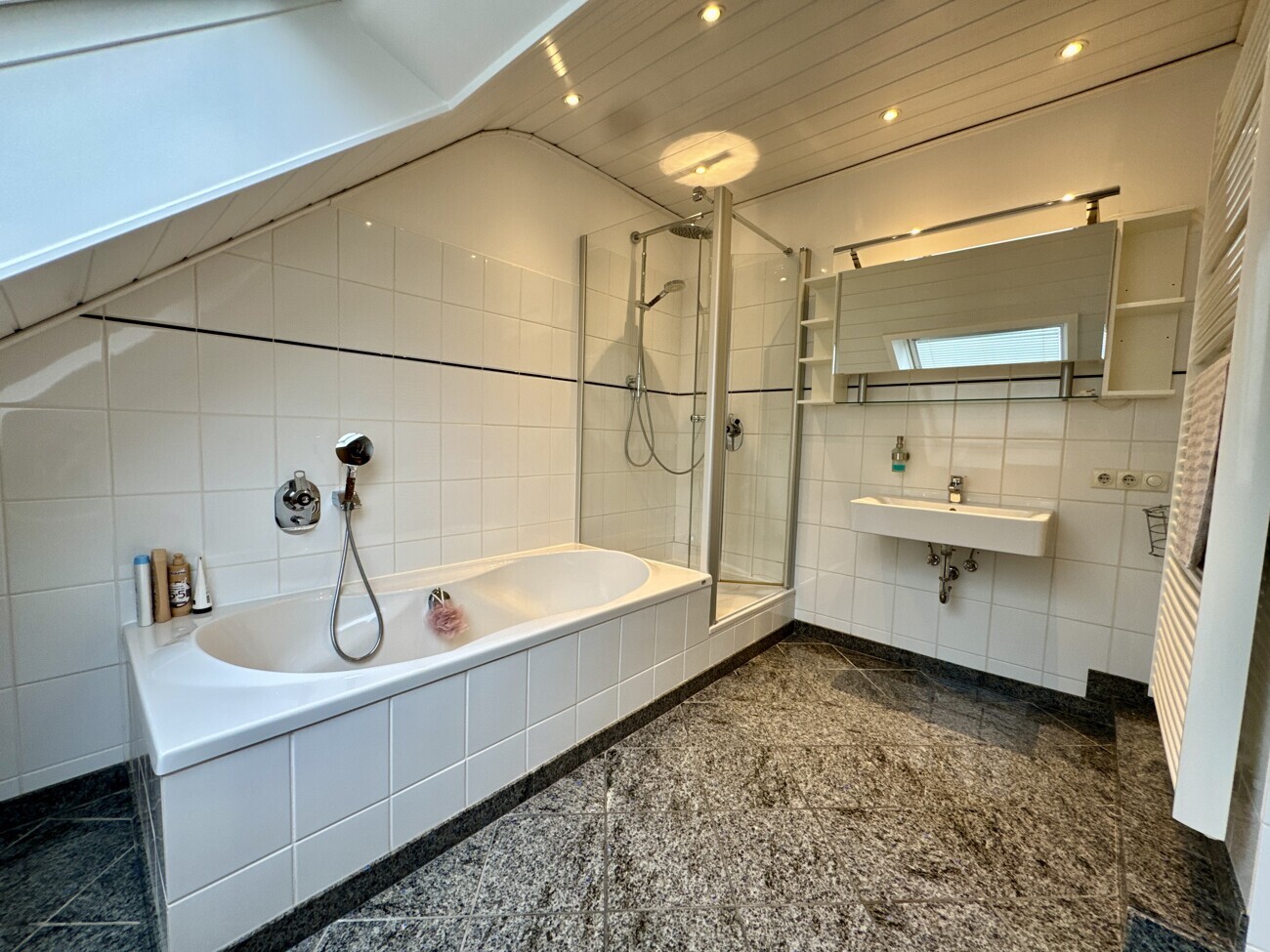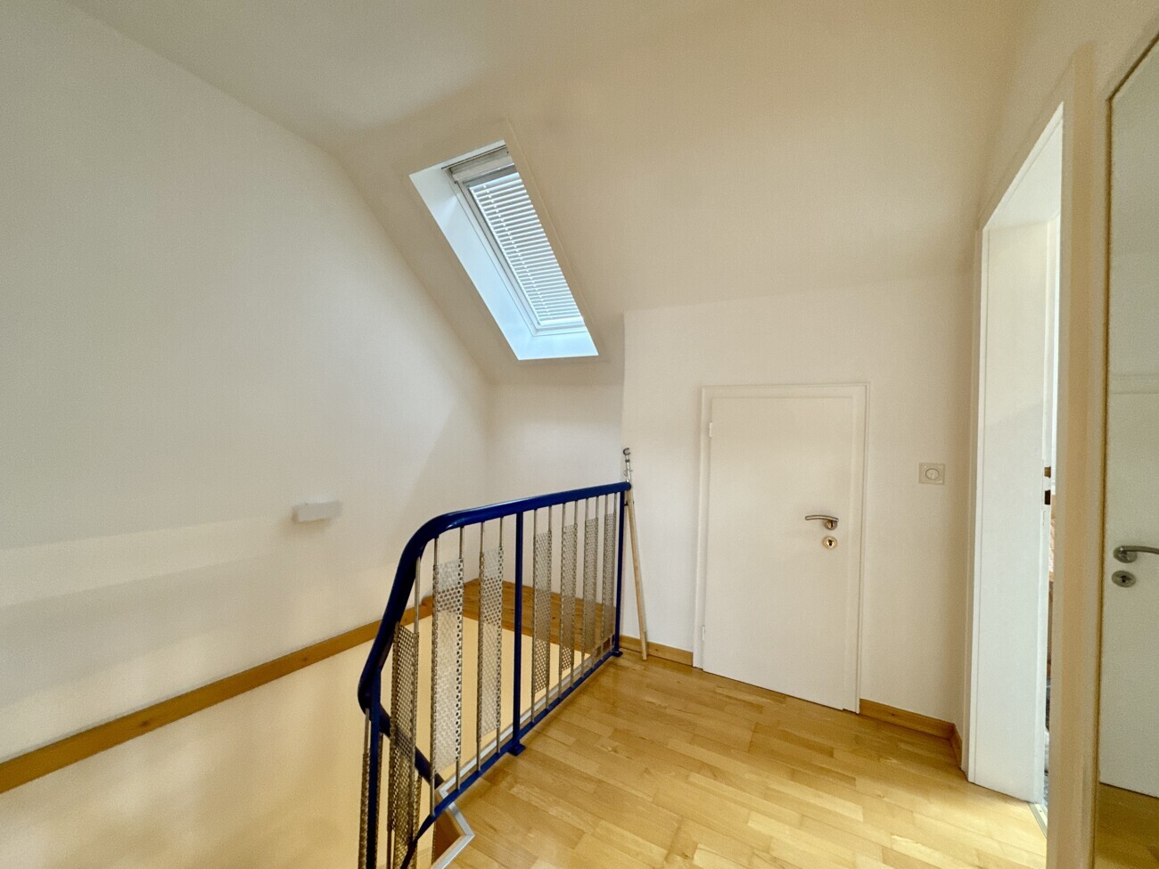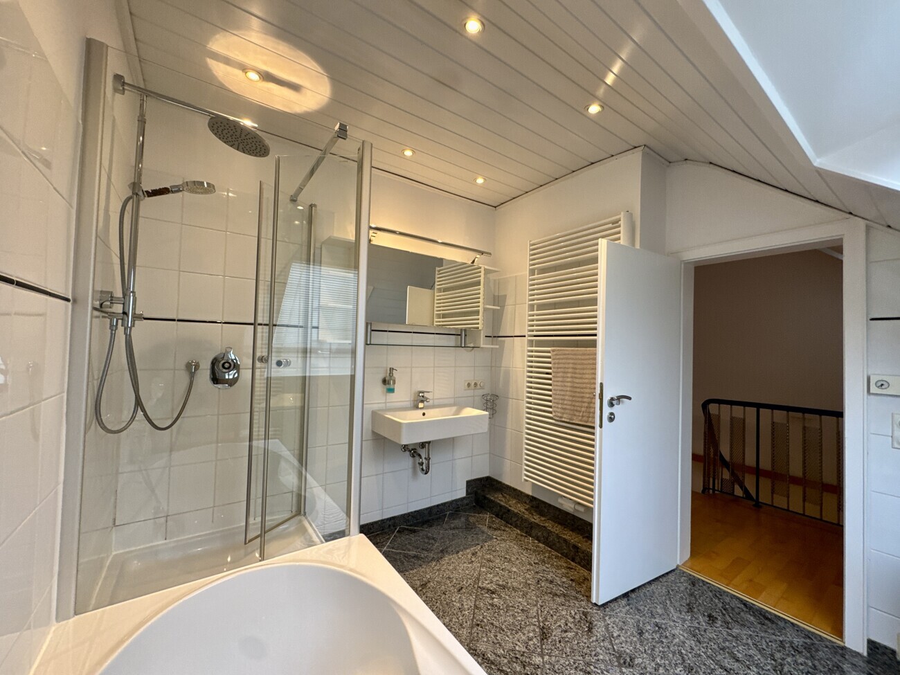 Das Obergeschoss verfügt über zwei gut geschnittene Schlafzimmer sowie ein WC. Das Elternschlafzimmer verfügt über ca. 21 m² mit Zugang zum Balkon. Perfekt, um die Abendsonne nach Feierabend zu genießen. Im Dachgeschoss steht Ihnen ein großzügiger Raum mit etwa 17 m² zur Verfügung, der sich hervorragend als Spielzimmer oder auch als Homeoffice eignet. Das moderne Tageslichtbad mit Dusche und Badewanne sorgt hier für zusätzlichen Komfort.