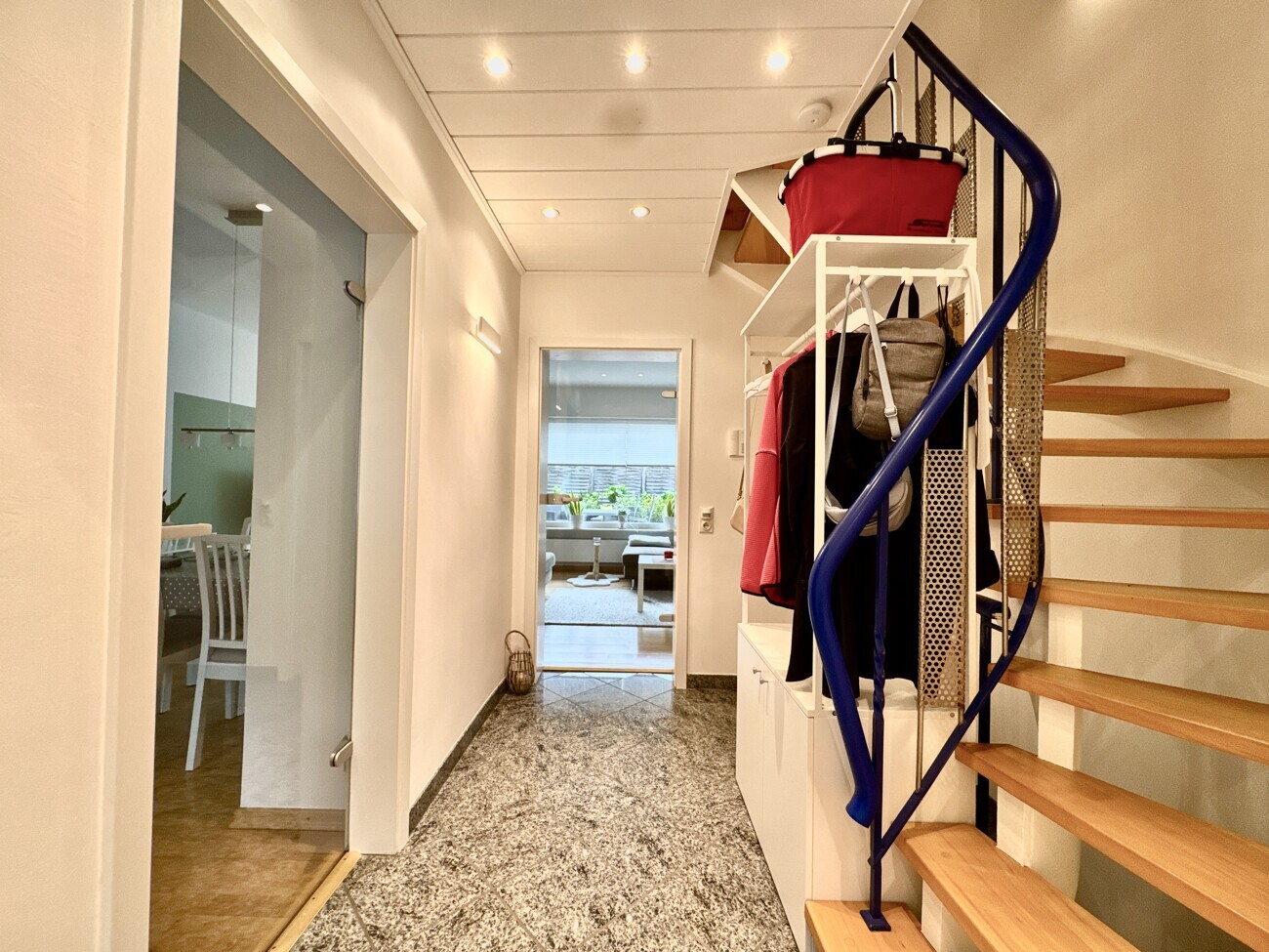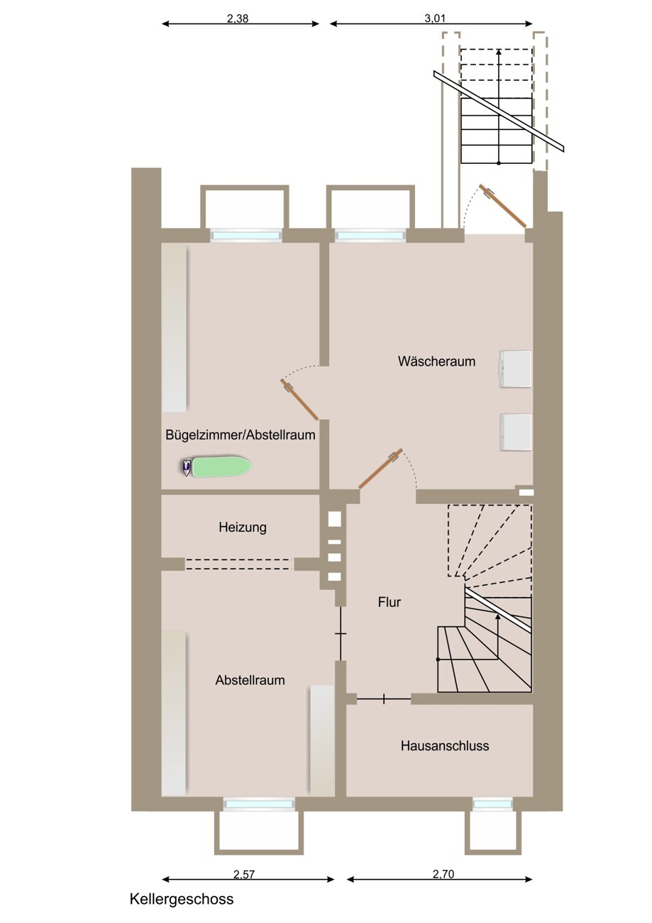 Der voll unterkellerte Bereich bietet viel Stauraum und Nutzfläche: Neben einem Waschraum, einem Bügel- und Abstellzimmer sowie einem Hausanschlussraum finden Sie hier auch einen separaten Abstellraum mit Zugang zum Garten über eine Außentreppe – praktisch und funktional zugleich.