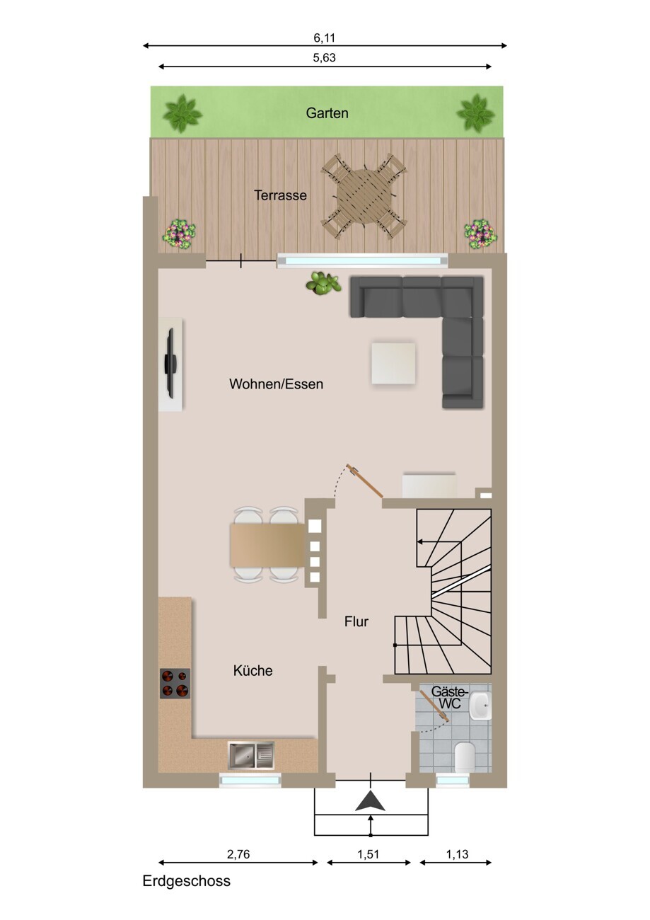Im Erdgeschoss erwartet Sie ein offener, heller Grundriss: Der großzügige Wohn- und Essbereich mit moderner, offener Küche ist das Herzstück des Hauses und bietet direkten Zugang zur sonnigen Terrasse mit kleinem Gartenabschnitt – ideal für gemütliche Stunden im Freien. Ein Gäste-WC rundet das Erdgeschoss ab.