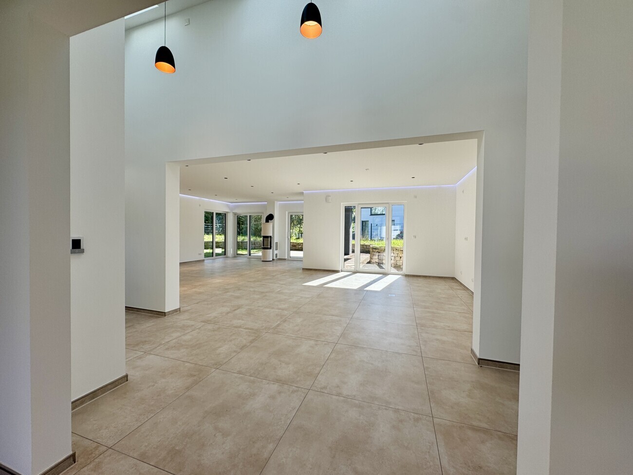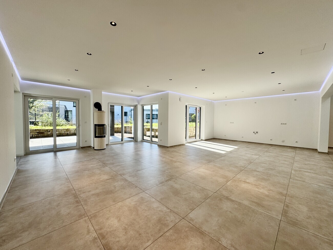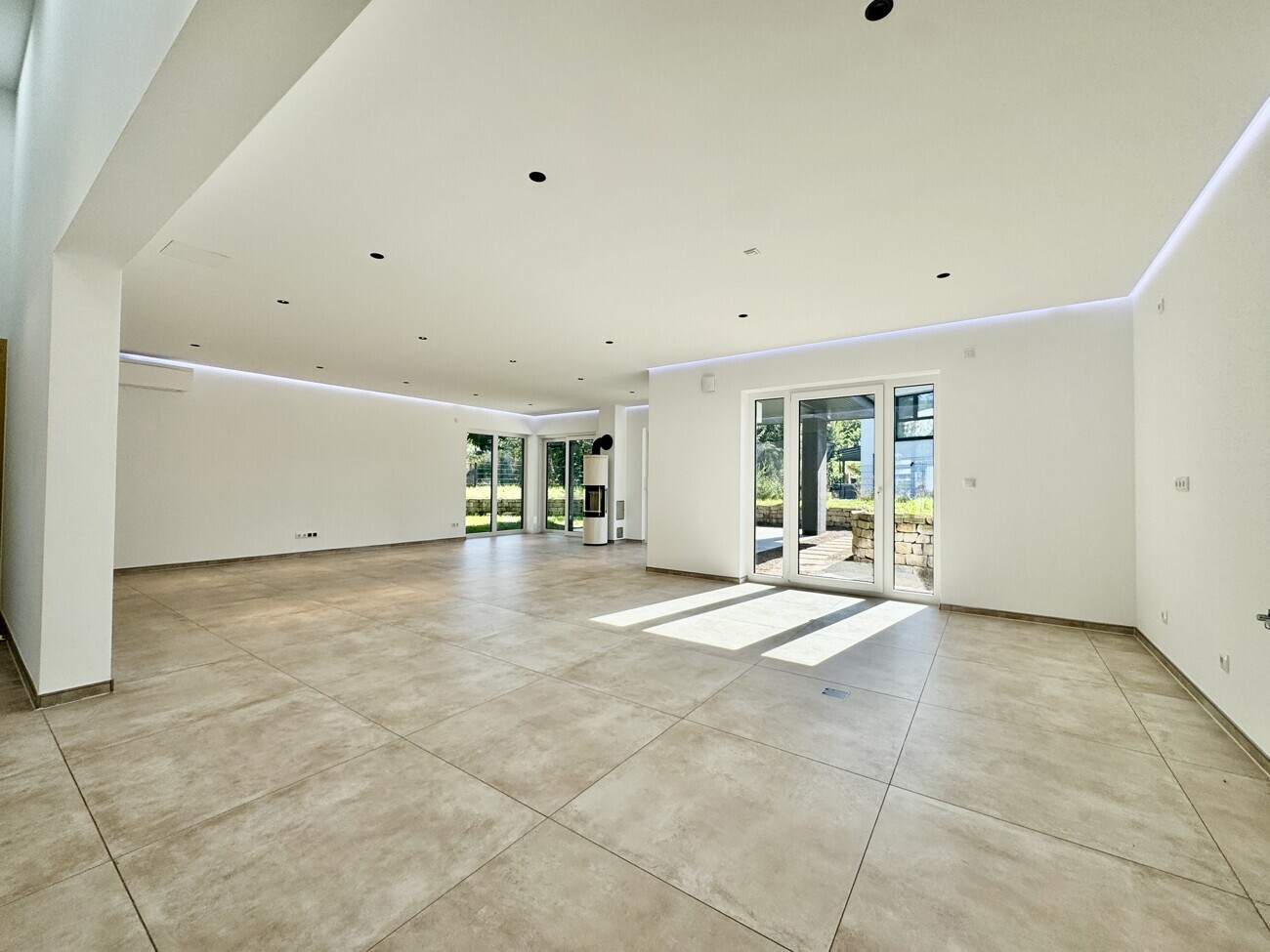 Der offene Koch-, Ess- und Wohnbereich erstreckt sich über ca. 57 m² und bietet einen einzigartigen Blick auf die knapp 30 m² große Südterrasse. Hochwertige 90×90 cm Fliesen, ein eleganter Specksteinofen und smarte Lichtsteuerung mit dimmbaren und farbwechselnden Lichtakzenten schaffen eine Atmosphäre von zeitloser Eleganz. Eine integrierte Klimaanlage sorgt an warmen Tagen für ein angenehmes Raumklima.