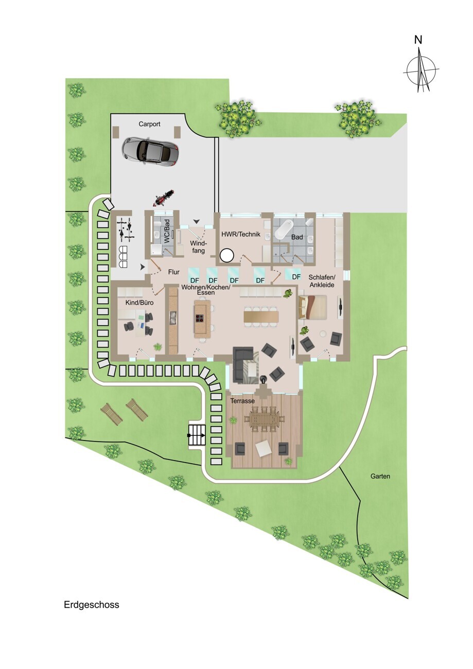 - Bodentiefe Fenster – sorgen für helle, lichtdurchflutete Räume
