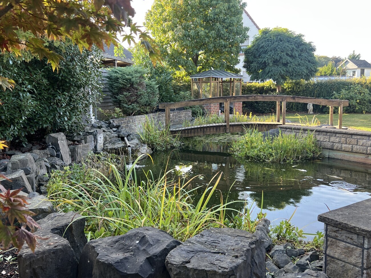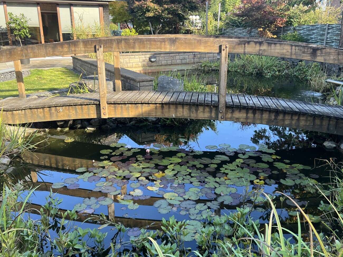 Mehrere Loggien und eine großzügige Sonnenterrasse laden dazu ein, die ruhige Umgebung und den Blick ins Grüne zu genießen. Der vollständig eingezäunte Garten ist ein Paradies für Gartenliebhaber und Tierfreunde – hier lässt sich Privatsphäre und Natur gleichermaßen erleben. Ein besonderes Highlight ist der liebevoll angelegte Teich mit Koi-Fischen, der dem Garten eine einzigartige, fast meditative Stimmung verleiht.