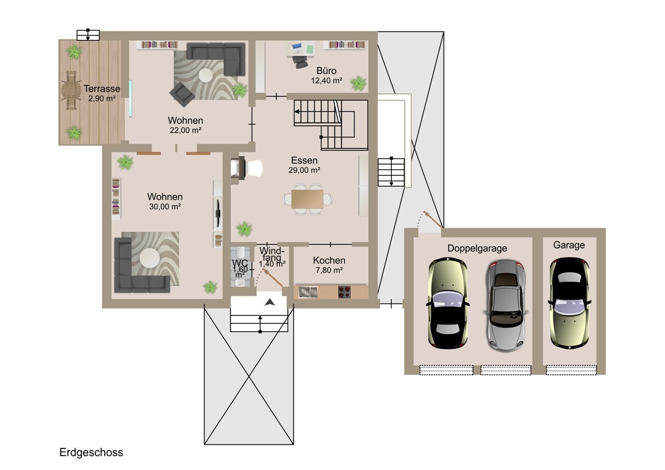 Im Erdgeschoss erwartet Sie ein offenes und lichtdurchflutetes Koch- und Esszimmer mit ca. 37 m² Fläche. Hier wird das familiäre Miteinander zum Erlebnis. Ein angrenzendes Büro bietet perfekte Voraussetzungen für das Arbeiten im Homeoffice, lässt sich jedoch ebenso als Gäste- oder Schlafzimmer nutzen.