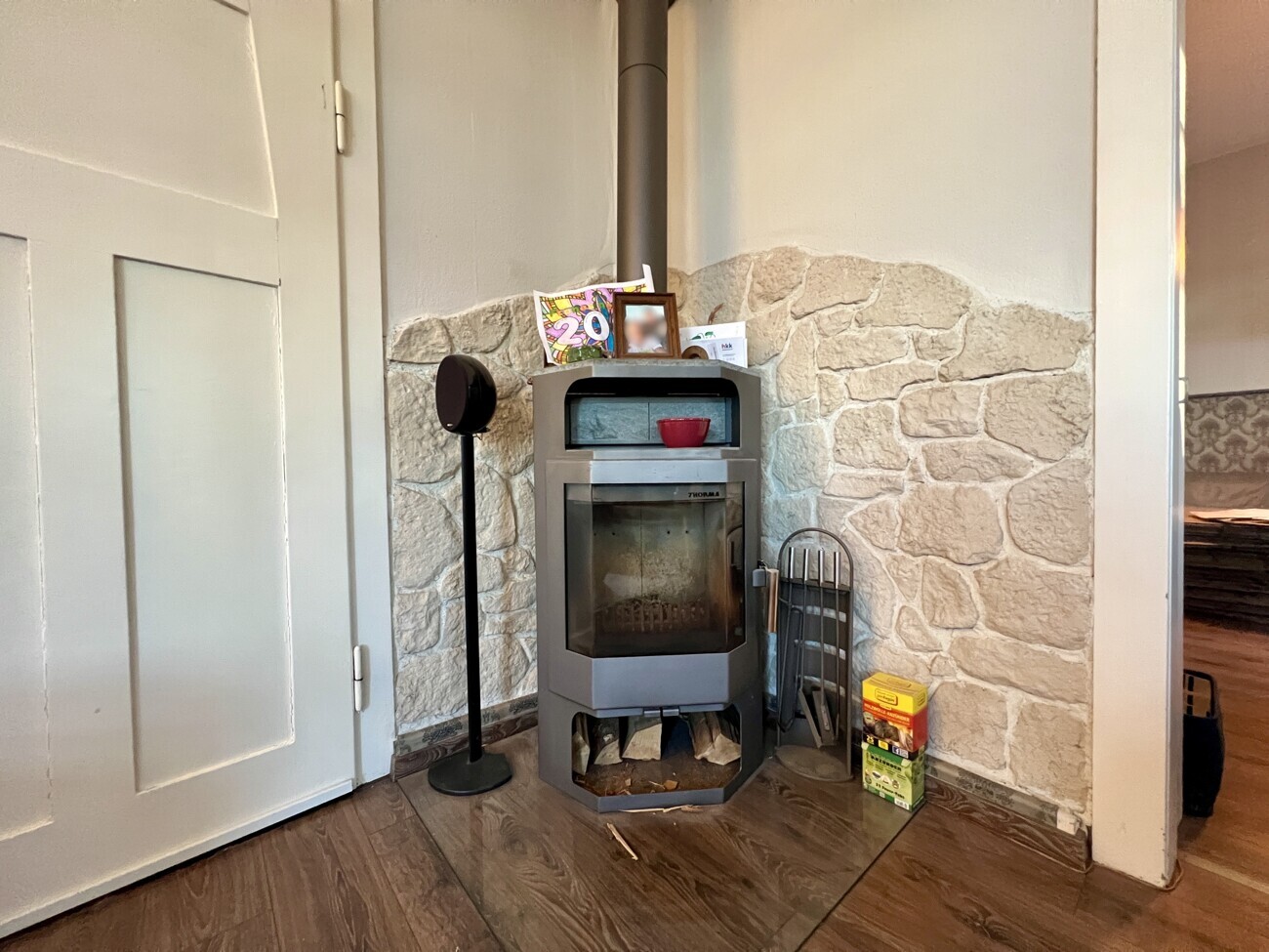 Im Erdgeschoss öffnet sich rechterhand das Wohn- und Esszimmer mit Kaminofen. Eine Holzschiebetür gliedert den Raum flexibel und schafft je nach Bedarf Offenheit oder Rückzug – ideal für Familienleben, Gäste oder ruhige Abende.