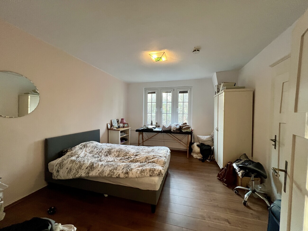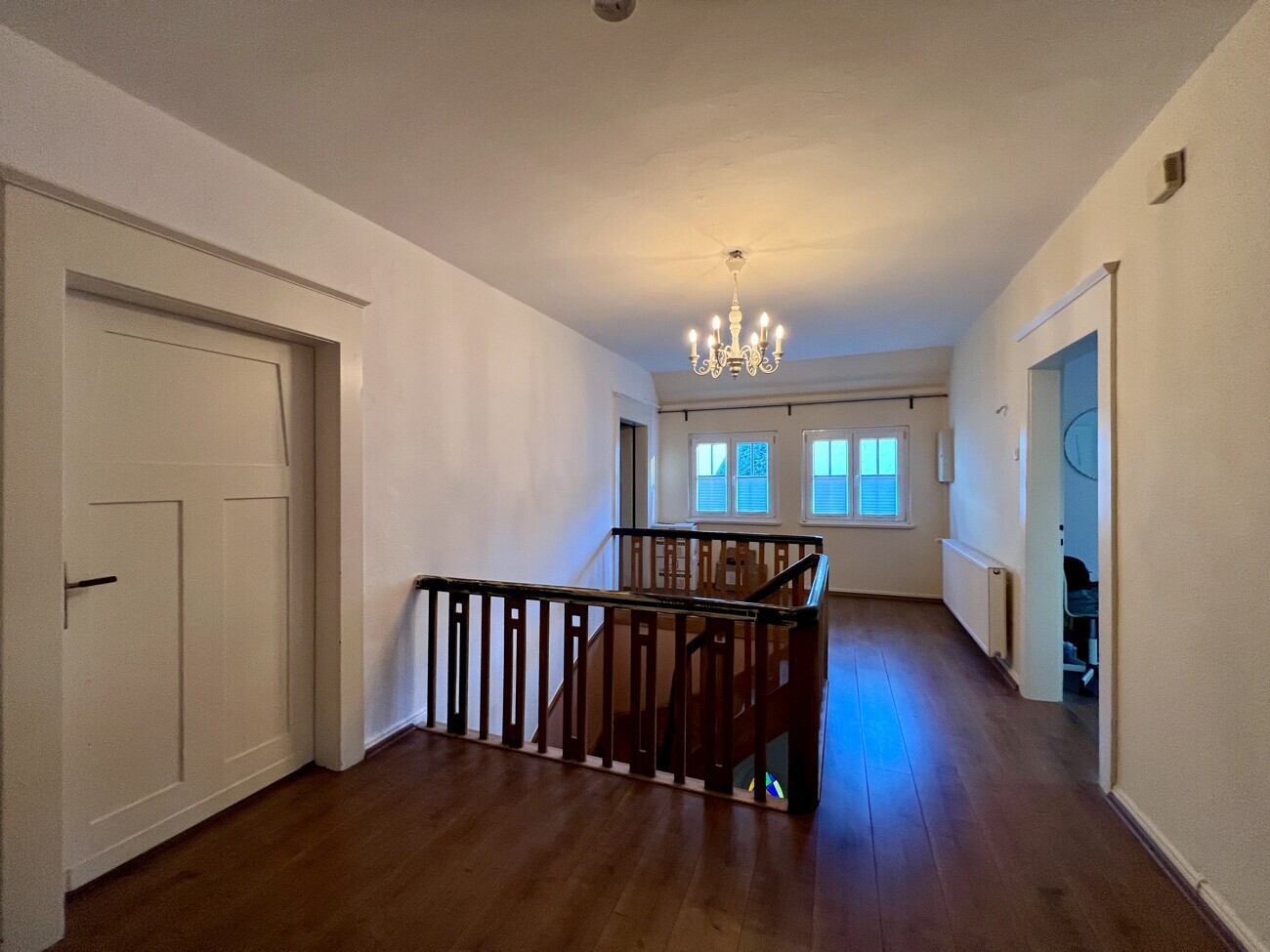 Über die historische Holztreppe gelangt man ins Obergeschoss. Hier stehen drei Schlafzimmer, ein Tageslichtbad sowie ein separates Büro zur Verfügung – perfekt für konzentriertes Arbeiten im Homeoffice oder als Rückzugsraum.