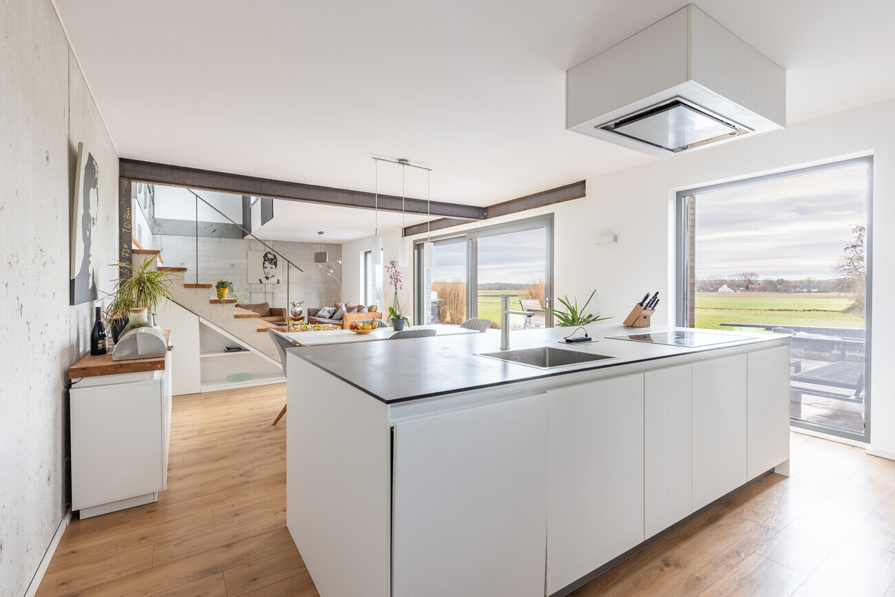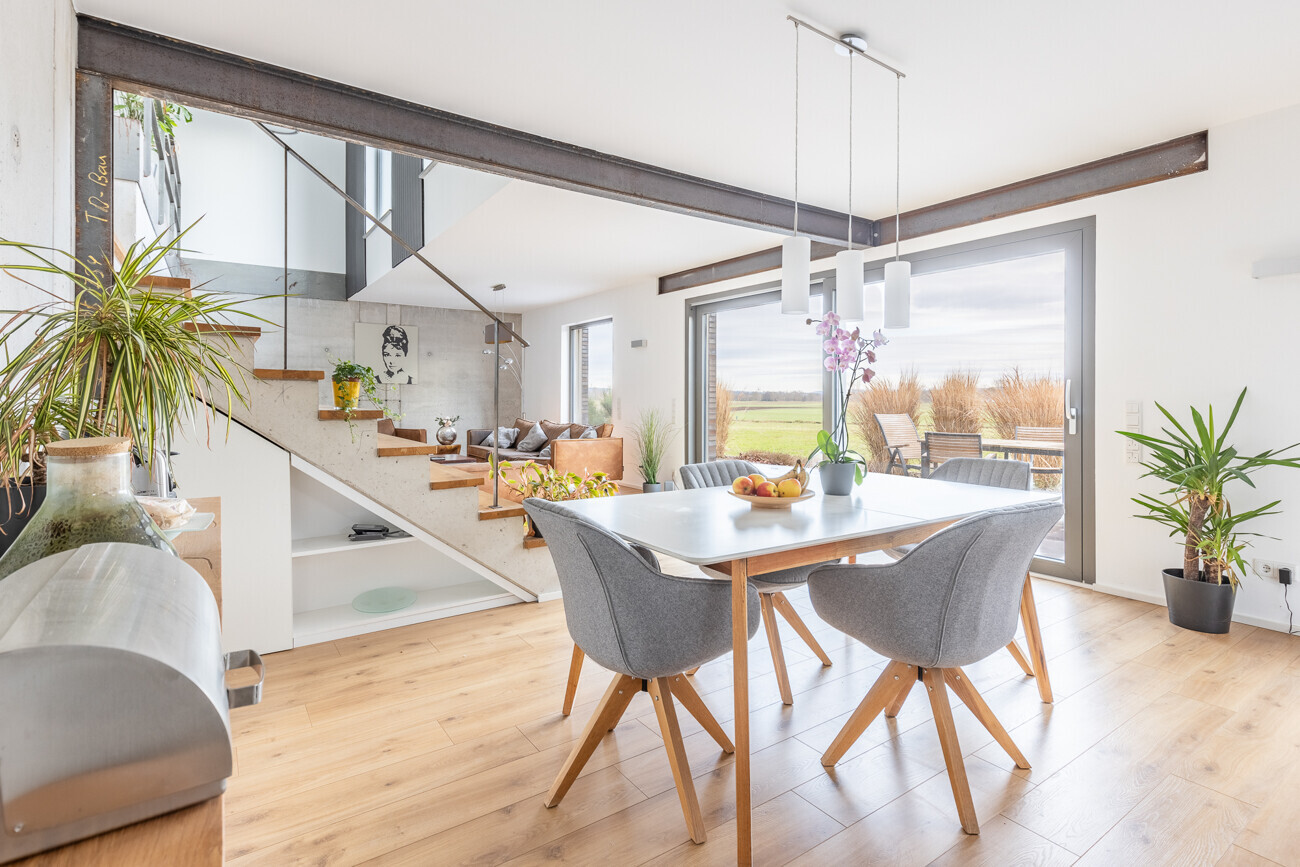 Über wenige Stufen öffnet sich die untere Ebene zum zentralen Lebensmittelpunkt des Hauses. Der offen gestaltete Wohn- und Essbereich mit integrierter Küche bildet das Herzstück der Immobilie. Großzügige Fensterflächen führen direkt auf die weitläufige Terrasse und eröffnen einen dauerhaft unverbaubaren Weitblick in die umgebende Landschaft – ein wesentliches Qualitätsmerkmal dieses Grundstücks.