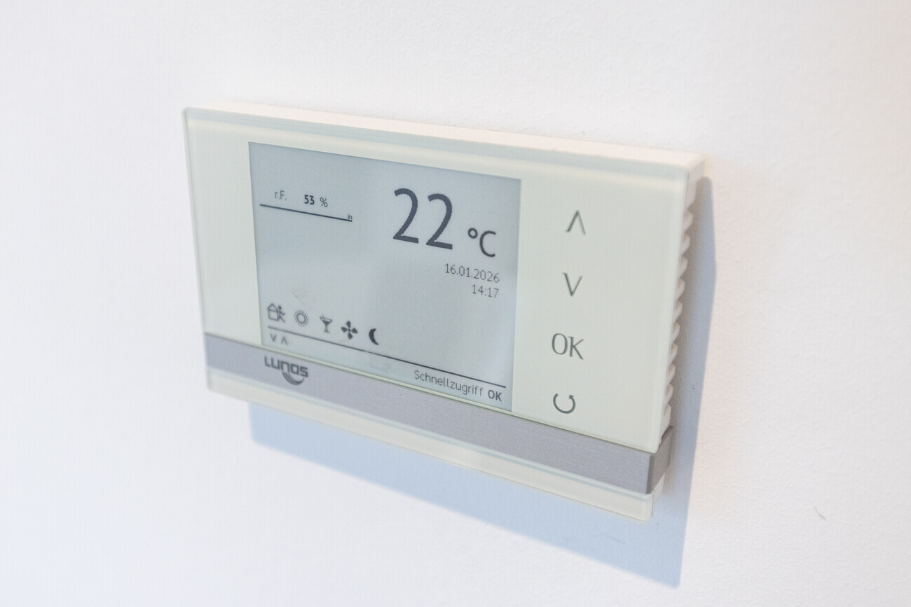 Das Gebäude wurde als KfW-55-Effizienzhaus errichtet und verbindet architektonische Qualität mit einem hohen energetischen Anspruch. Eine Photovoltaikanlage mit Stromspeicher unterstützt die nachhaltige Energieversorgung des Hauses und ergänzt die moderne Wärmepumpentechnik des Herstellers NIBE in Verbindung mit einer flächendeckenden Fußbodenheizung. Ein Kaminzug ist im Wohnbereich vorhanden und ermöglicht die optionale Nachrüstung eines Kaminofens.