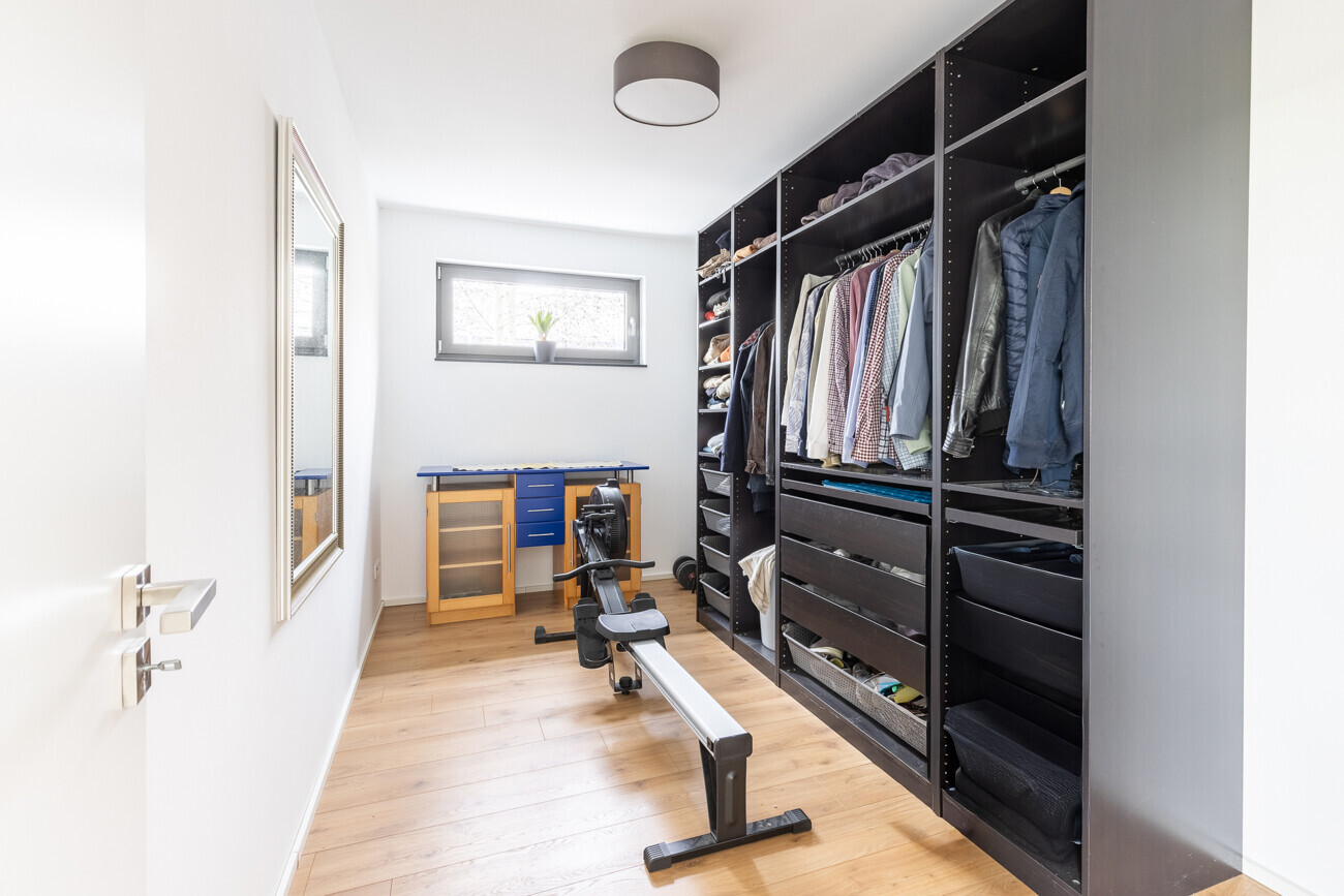 Die obere Ebene bildet den privaten Rückzugsbereich des Hauses. Hier befinden sich das Schlafzimmer mit angeschlossenem Ankleideraum, ein großzügiges Tageslichtbad mit hochwertiger Ausstattung sowie ein separates Gäste-WC. Ergänzt wird diese Ebene durch ein Büro, das sich ideal für konzentriertes Arbeiten eignet, sowie einen eigenständigen Hauswirtschafts- und Technikraum, der Funktionalität und Ordnung gewährleistet.