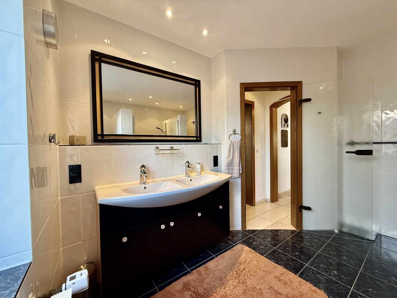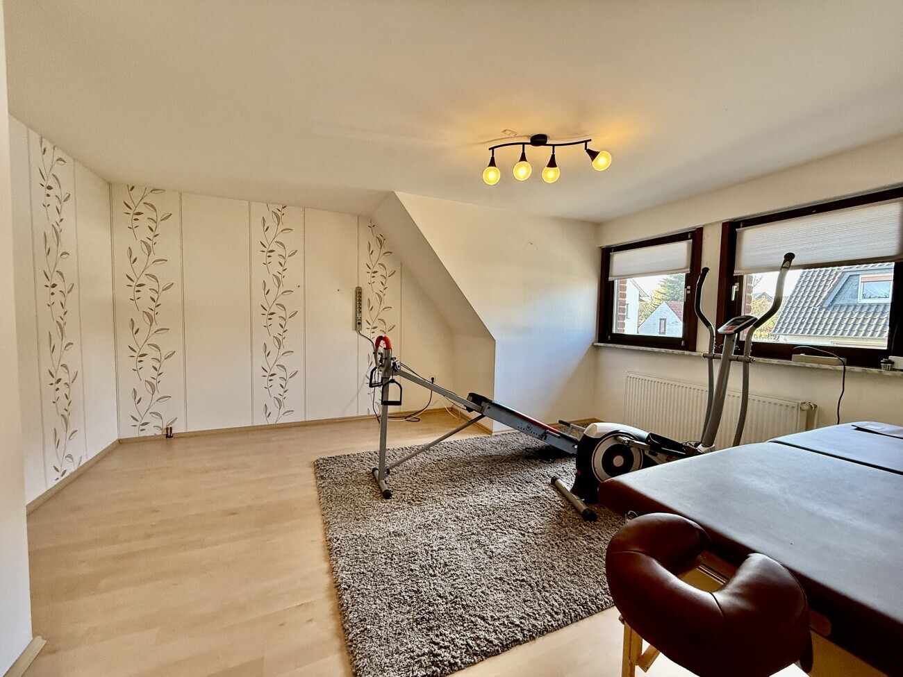 Das Obergeschoss bietet weitere vielseitig nutzbare Räume. Hier befindet sich ein modernisiertes ca. 12 m² Badezimmer mit ebenerdiger Dusche und Badewanne. Zusätzlich gibt es ein etwa 17 m² großes Hobbyzimmer, das sich ideal als Kinderzimmer eignet. Ein besonders großzügiger Bereich wurde früher als Arbeitsbereich mit eigener Küche genutzt und verfügt über Zugang zu einem Balkon. Dieser Raum lässt sich flexibel gestalten – beispielsweise als großzügiges Hauptschlafzimmer, Studio, Homeoffice oder zusätzlicher Wohnbereich. Auch dieser Raum bietet Zugang zu einem eigenen Balkon und sorgt für eine helle und angenehme Wohnatmosphäre.