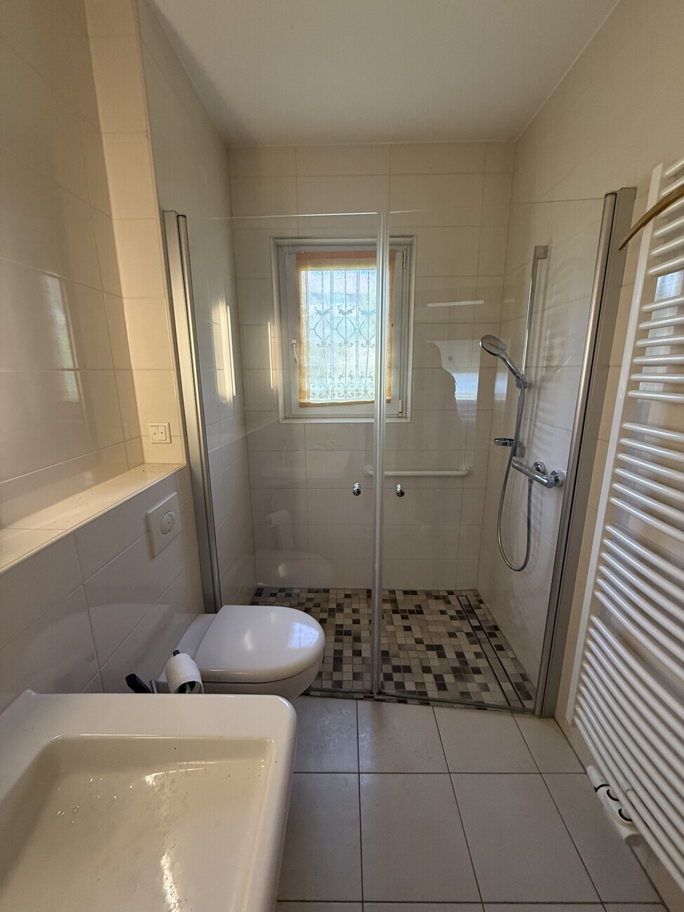 - Modernes Tageslichtbad im Erdgeschoss mit ebenerdiger Dusche, Waschtisch, WC und Handtuchheizung