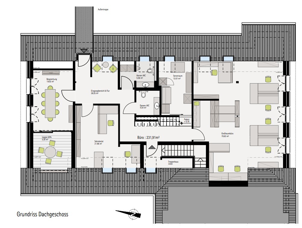 Bereits beim Betreten empfängt Sie ein großzügiger Eingangsbereich mit ca. 28 m², der sich hervorragend als stilvoller Empfang oder repräsentativer Wartebereich eignet. Die durchdachte Raumstruktur im Dachgeschoss umfasst zudem ein separates Sekretariat (ca. 22 m²), einen Serverraum sowie ein lichtdurchflutetes Großraumbüro mit ca. 70 m² und derzeit sieben Arbeitsplätzen. Ein besonderes Highlight ist der Besprechungsraum mit direktem Zugang zu einer ca. 5 m² großen Loggia. Separate Damen- und Herren-WCs unterstreichen den professionellen Anspruch dieser Einheit.