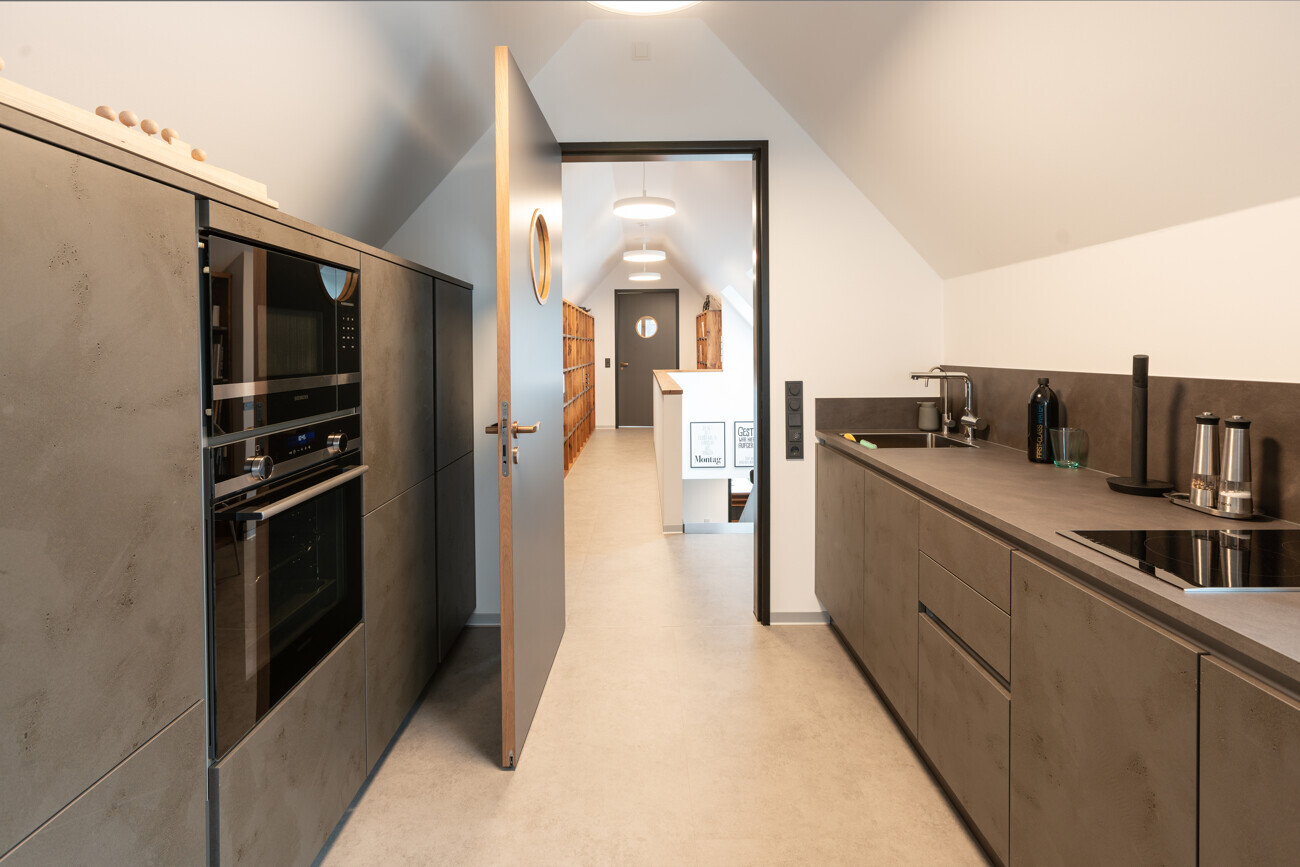 Die Ausstattung ist durchgehend hochwertig und gepflegt. Optional können die modernen Einbauküchen von Nolte, sowie maßgefertigte Tische und Regalsysteme übernommen werden. Weitere Möblierung ist nach Absprache ebenfalls möglich.