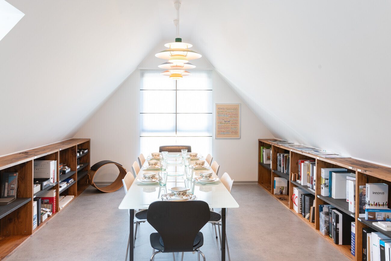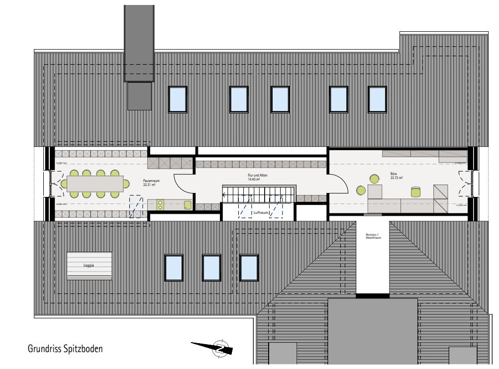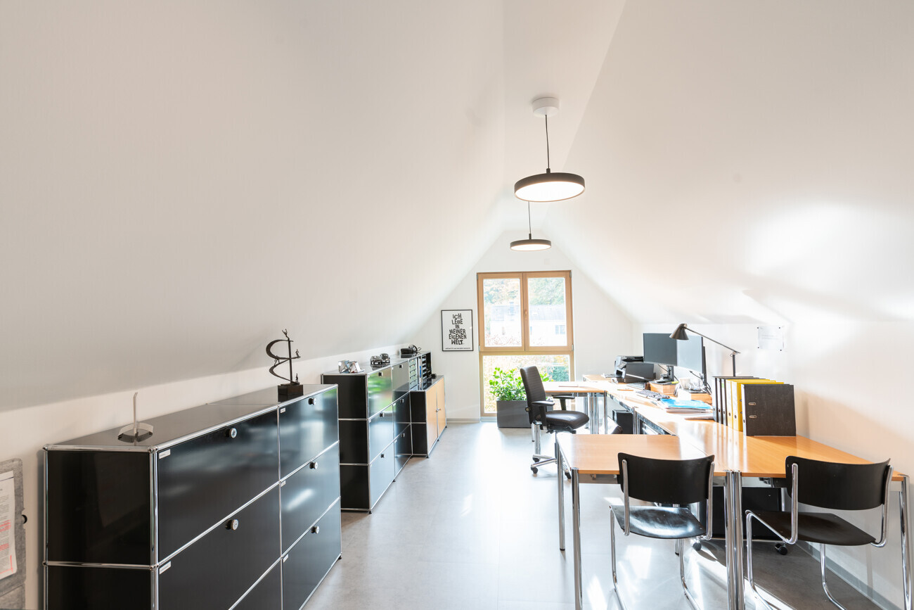 Der ausgebaute Spitzboden ergänzt die Fläche funktional und zugleich charmant: Hier stehen ein Pausen-/Besprechungsraum (ca. 22 m²), ein weiteres Büro (ca. 22 m²) sowie zusätzliche Flächen, etwa für Garderobe oder Aktenlager, zur Verfügung.