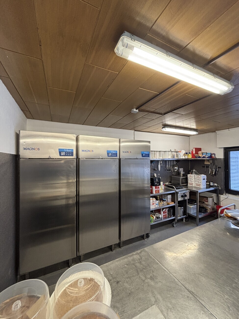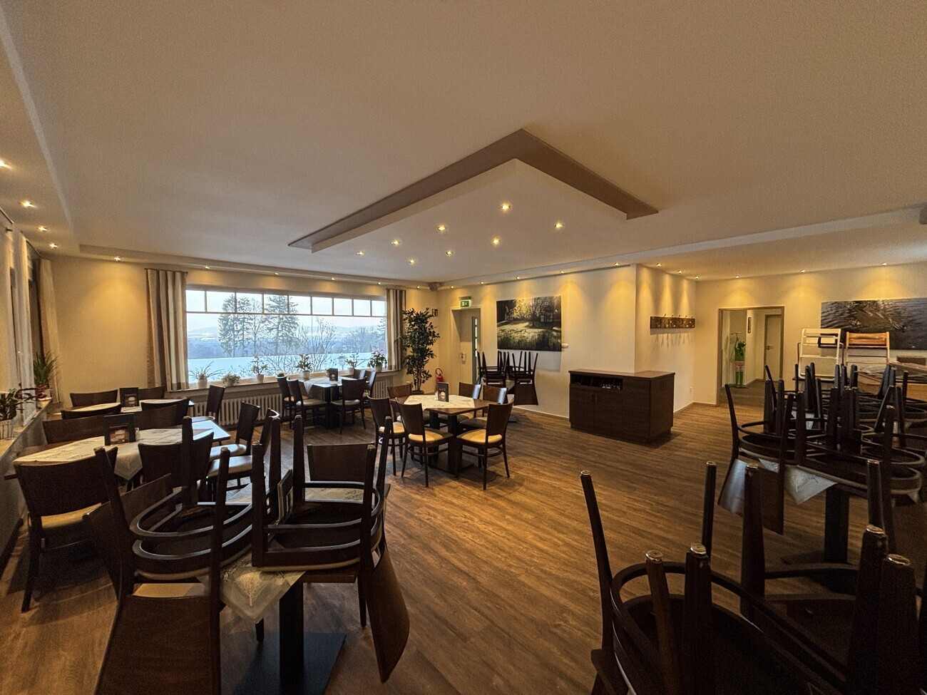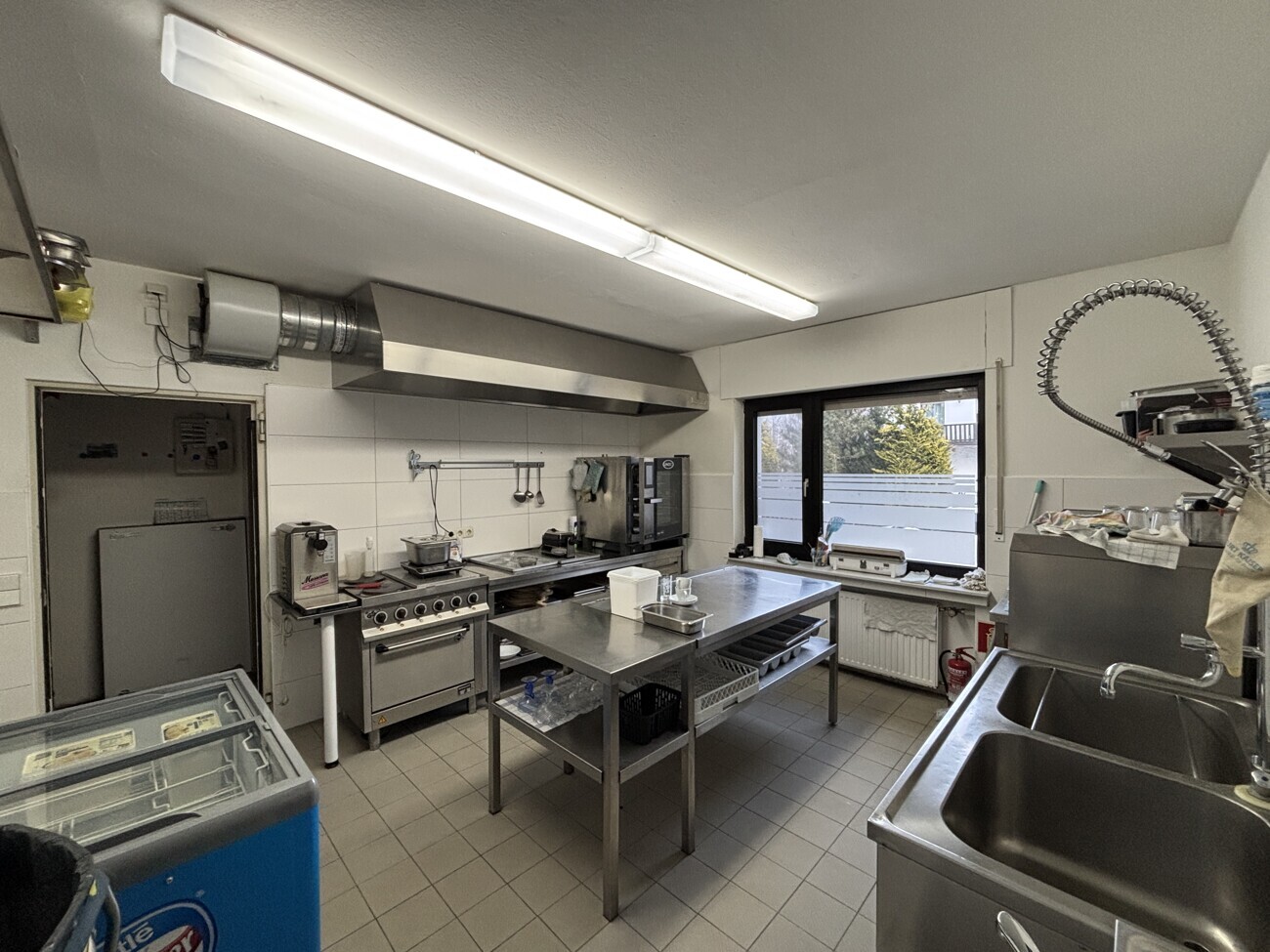Im Erdgeschoss befindet sich das Café mit ca. 200 m² Nutzfläche. Die Flächen sind funktional gegliedert und umfassen einen großen Saal, einen Flur, das Treppenhaus sowie einen Schankraum mit Bar. Darüber hinaus stehen eine Behindertentoilette, eine Herrentoilette und eine Frauentoilette zur Verfügung. Für den Betriebsablauf sind zwei Küchenräume vorhanden, ergänzt durch ein Büro sowie eine weitere Toilette. Die Sanitärbereiche im Erdgeschoss wurden im Jahr 2022 erneuert. Damit eignet sich die Raumstruktur nicht nur für das klassische Tagesgeschäft, sondern auch für Veranstaltungen und Gruppenbewirtung, während die Beherbergung im Obergeschoss zusätzliche Auslastung und Einnahmen ermöglicht.